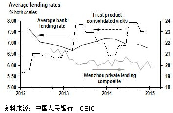第一,宏观经济发展依旧疲弱。近期发布的数据显示,中国2015年初的经济活动减速,1月份和2月份的主要经济指标全部弱于预期,尤其是在国内需求方面。我们将第一季度经季调后年化的GDP增长率预测从环比增长6.3%下调至环比增长5.3%,将2015年全年预测从同比增长7.2%下调至同比增长7.0%。预计政府近期推出的支持增长的政策,尤其是央行在11月份的首次降息,其时滞效应将会从2015年第二季度开始对增长势头产生影响。在这种背景下,为了稳定经济增长和降低实体经济的借贷成本(图2),包括降准在内的货币宽松措施就获得充分的理由。