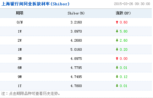 上海银行间同业拆放利率(Shibor)显示,隔夜Shibor报3.2160%,上涨0.60个基点;7天Shibor报3.8970%,下跌5.80个基点;3个月Shibor报4.8975%,与昨日持平。