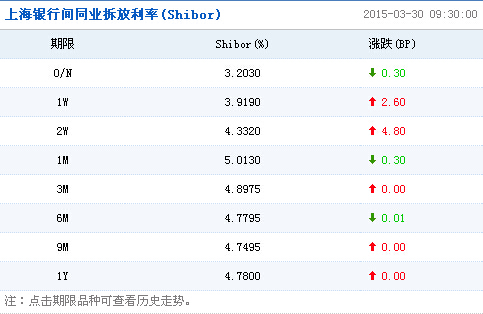 上海银行间同业拆放利率(Shibor)显示,隔夜Shibor报3.2030%,下跌0.30个基点;7天Shibor报3.9190%,上涨2.60个基点;3个月Shibor报4.8975%,继续与前期持平。