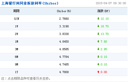 上海银行间同业拆放利率(Shibor)显示,隔夜Shibor报2.7660%,下跌12.10个基点;7天Shibor报3.3190%,下跌18.70个基点;3个月Shibor报4.8585%,下跌2.95个基点。