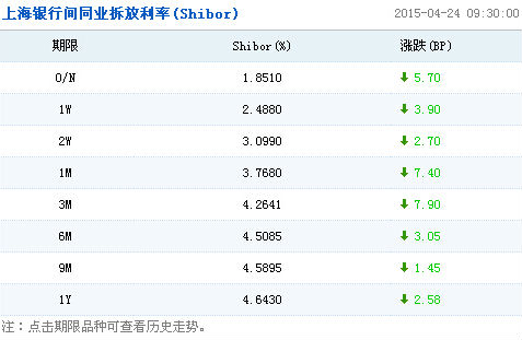 上海银行间同业拆放利率(Shibor)显示,隔夜Shibor报1.8510%,下跌5.70个基点;7天Shibor报2.4880%,下跌3.90个基点;3个月Shibor报4.2641%,下跌7.90个基点。