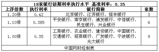 具体来看,活期存款方面,北京银行、江苏银行、恒丰银行的利率均上浮至基准利率的1.2倍,达到0.42%,为19家银行中最高水平。而包括工行、农行、中行、建行、交行在内的9家银行则执行0.35%的基准利率。