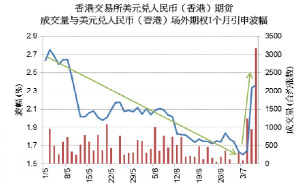 港交所表示,随着离岸美元兑人民币波幅加大,美元兑人民币期货的成交量相应增加。人民币贬值趋势会否持续值得市场紧密关注。