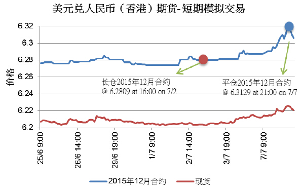 港交所指出,通过仔细观察近日的即期价格波动,可得知人民币相对美元于7月2日起开始贬值。以下为根据历史数据的短期模拟交易,在7月2日16:00以6.2809购买2015年12月的合约,并于7月7日21:00以6.3129出让该合约。该合约的价格增加了0.032,而10获利32000港元。按10张合约的最低按金支出120000港元计,为期5天的模拟交易的回报为26.7%。