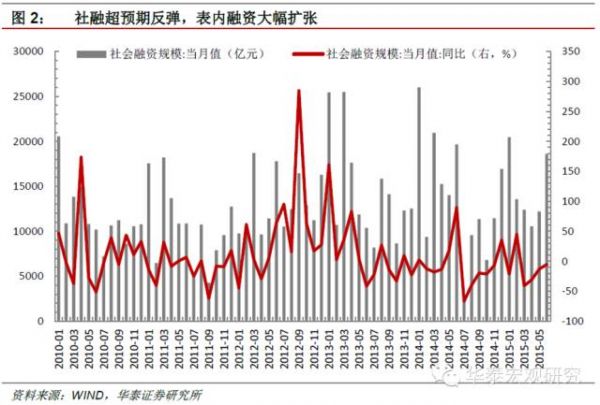 社融超预期反弹, 表内融资大幅扩张。6月份社会融资总量1.86万亿元,同比少增长1073亿元,上半年社融增量8.81万亿元,比去年同期少1.46万亿元。其中6月份表内融资有所扩张,6月份新增人民币贷款13280亿元,同比多增2487亿元;受近期政策对地方融资平台限制有所放松影响,表外融资略有扩张,企业债净融资增长2358亿元,同比减少268亿元,环比大增830亿元;信托委托贷款和未贴现银行承兑汇票共增加926亿元,相较去年同期仍然出现显著收缩。总体来看,表外收缩表内承接的趋势未改。
