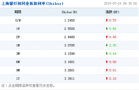 上海银行间同业拆放利率(Shibor)显示,隔夜Shibor报1.2450%,上涨0.70个基点;7天Shibor报2.5500%,下跌0.60个基点;3个月Shibor报3.1598%,下跌0.44个基点。