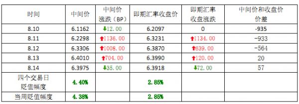 美元/人民币汇率8.10-8.14当周涨跌幅 中国金融信息网人民币频道制表