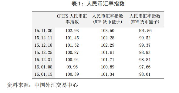 2015年12月11日,中国外汇交易中心正式发布CFETS人民币汇率指数,综合反映人民币对一篮子货币加权平均汇率变动,全面体现人民币价值变化。该指数货币篮子包括13种货币,采用考虑转口贸易因素的贸易权重法计算货币权重。其中,美元权重26.4%,欧元权重21.4%,日元权重14.7%。为了便于比较,中国外汇交易中心同时发布参考BIS货币篮子与SDR货币篮子的人民币汇率指数。由表1可以看出,参考一篮子货币,人民币汇率基本保持稳定。2016年1月15日,CFETS人民币汇率指数为100.39,较2014年末指数基期升值了0.39%;参考BIS货币篮子人民币汇率指数为101.34,较2014年末升值1.34%;参考SDR货币篮子人民币汇率指数为98.01%,较2014年末小幅贬值1.99%。