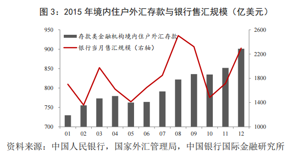 在人民币对美元贬值预期下,特别是年初五万美元换汇额度刷新后,居民购汇需求上升。离岸做空交易以及部分报道言论,进一步加剧市场恐慌情绪,推动居民盲目购汇、配置美元,人民币贬值预期深化扩散。2015年8月以来,银行平均售汇规模较上半年平均水平增长6.2%;12月存款类金融机构境内住户外汇存款达901.05亿美元,较年初增长23.5%(图3)。居民盲目购汇与贬值预期恶性循环,消减我国外汇储备规模,加剧人民币贬值压力。