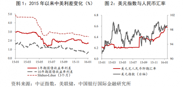 2015年12月,美联储启动2006年以来首次加息,货币政策迈入正常化进程,新兴市场资本外流压力增大。其中,据国际金融协会(IIF)报告,2015年中国资本外流逾5000亿美元。美联储公开市场委员会(FOMC)就联邦基金利率预测中位数为2016年四次加息。美联储加息支撑美元相对强势地位,我国货币政策则趋向宽松,中美利差将继续呈现下行趋势(图1),施压人民币对美元汇率。