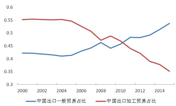 从2010年开始,中国出口占全球比重增长速度,显著高于进口占全球比重增长速度。中国出口正在转向高附加值型。来料加工、进料加工等低端贸易,逐渐从中国转移至其他新兴市场国家。在2010年,中国出口贸易中一般贸易的比重首次超过了加工贸易。