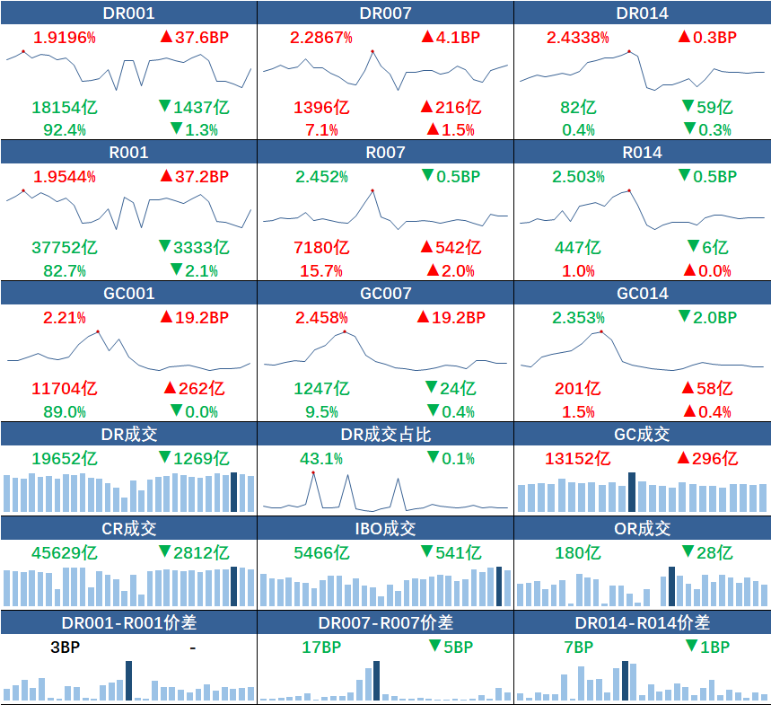 27日,银行间质押式回购市场隔夜品种大幅走升,迈向一周高点,其余品种变化不大。具体来看,DR001、R001加权平均利率分别涨37.6BP、37.2BP,报1.9196%、1.9544%;成交量分别减少1437亿元、3333亿元。DR007、R007加权平均利率分别涨4.1BP、跌0.5BP,报2.2867%、2.452%;成交额分别增加216亿元、542亿元。DR014、R014加权平均利率分别涨0.3BP、跌0.5BP,报2.4338%、2.503%。