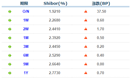 27日,上海银行间同业拆放利率(Shibor)隔夜品种从月内低点反弹近40BP,不过仍位于2%下方,其余品种波动不大。具体来看,隔夜Shibor涨37.50BP,报1.9210%;7天Shibor涨0.60BP,报2.2680%;14天Shibor涨1.70BP,报2.4410%。