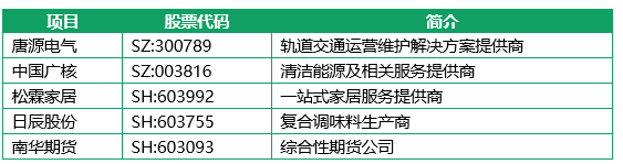 其中唐源电气登陆创业板,中国广核登陆深交所主板,松霖家居、日辰股份、南华期货登陆上交所主板。