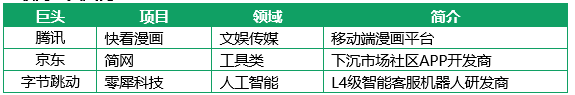 腾讯战略投资了移动端漫画平台快看漫画,而此前字节跳动已经两次投资快看漫画,目前从工商信息显示,其依旧持有快看漫画9.7%的股份,三方关系的后续发展还需要进一步观察;京东数科战略投资下沉市场社区APP简网,下沉市场也成为互联网新用户的重要增长来源;根据工商信息显示,字节跳动近期投资了L4级智能客服机器人研发商零犀科技。