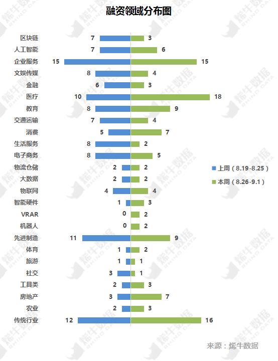 其中医疗(18起)、传统行业(16起)、企业服务(15起)是本周最受关注的领域。医疗领域本周披露18起融资事件,较上周10起增加80%,生活服务领域融资数量由上周8起降至本周2起。