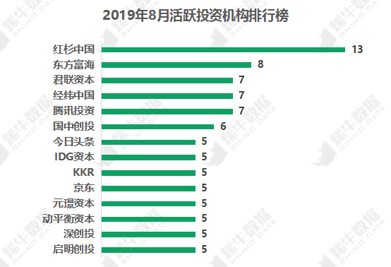 本月最活跃的机构为红杉资本中国基金,出手13次;东方富海出手8次位列第二。其他活跃的机构包括君联资本、经纬中国、腾讯投资、国中创投等。