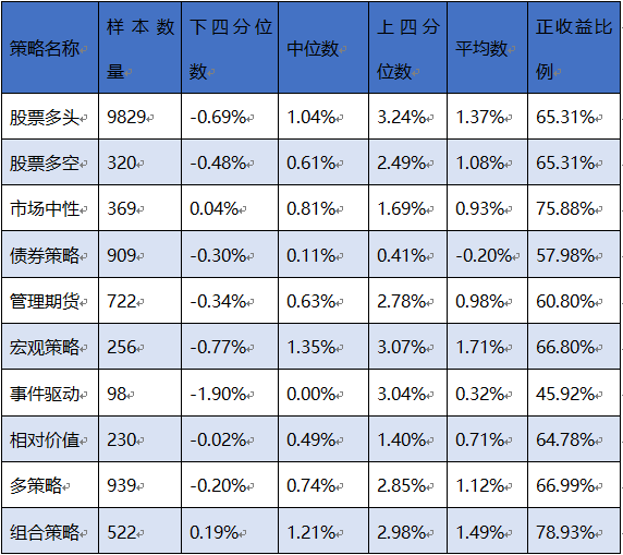 关于各策略基金的收益分布情况,我们选取满足以下四个条件的私募基金,作为有效基金样本,来观察各策略累计收益的分位数水平。选取有效样本的条件:(1) 成立半年以上:即基金在2019年12月1号以前有净值数据;(2) 当月有净值披露:基金在2020年5月份有净值披露;(3) 非结构化基金;(4) 非单账户。