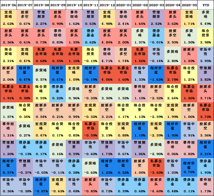 5月份市场随着海外疫情形势改善及国内经济回暖呈现出震荡上行态势,在此情况下各策略私募基金表现也较上月出现明显好转。其中,宏观策略收益表现最好,多策略、股票多头策略收益表现紧随其后。今年以来收益表现最好的是多策略和组合策略,分别获得4.49%和3.98%的累计收益。