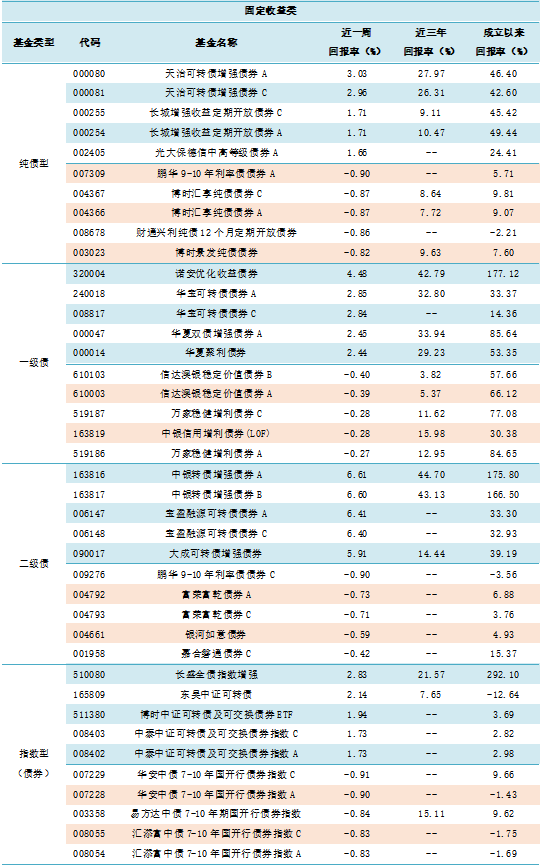 央行小幅投放资金帮助市场平稳跨月,流动性整体基本维持平稳。货币市场利率变动不一,货基平均收益基本与前一周持平;债市整体出现回调,股债跷跷板效应明显。不足半数纯债型基金近一周净值收益为正,近八成一级债基金和九成二级债基金近一周净值收益上涨,不足两成债券指数基金近一周净值收益为正。得益于权益市场走强,可转债基金整体收益良好。
