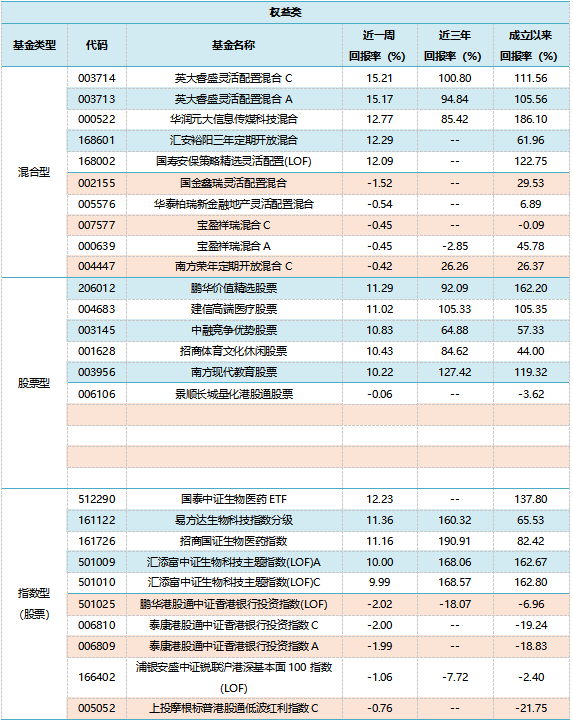 表1:上周各权益类基金收益表现(涨幅前5位及跌幅前5位)
