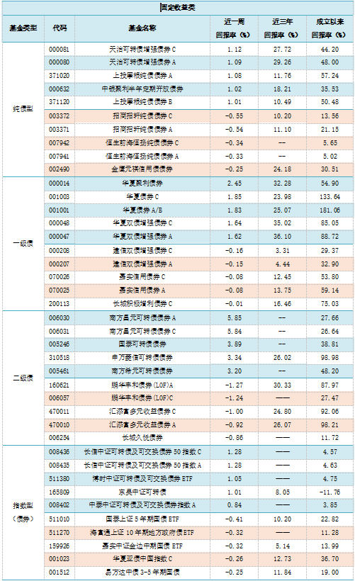 债市上周延续回调,除可转债周强外,利率债及信用债均小幅波动。八成纯债型、一级债和债券指数型基金近一周净值收益为正,九成二级债基金近一周净值收益上涨。可转债整体维持涨势,重配转债或可转债主题基金收益居前。具体来看,纯债型基金上周平均净值收益率为0.07%,一级债型基金上周平均净值收益率为0.35%,二级债基金上周平均净值收益率为0.53%,债券指数基金上周平均净值收益率为0.39%。