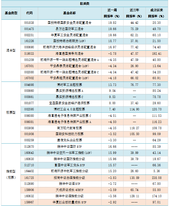 个基表现方面,上周国防军工板块大幅走强,因此重配相关行业个股的基金收益涨幅居前;而电子、半导体等科技板块走弱,相关主题投资基金表现不佳。