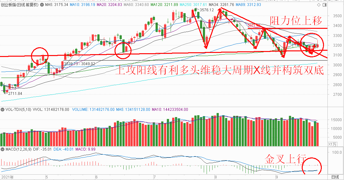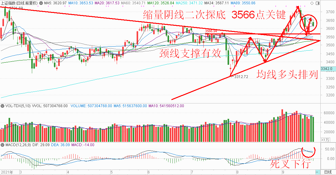 沪指看,消化3650点阻力的缩量调整阴线系二次探底诉求,也许修复MACD指标死叉诉求,波动率未破3566点一线强支撑,符合进二退一结构;创业板指数低开高走缩量阳线突破3200点,明确3085点区域买盘承接强,结合短期均线阻力变支撑、MACD指标金叉上行,以及阻力位还有空间情况,预期后市试探并突破3300点概率大;结合科创50指数五浪末端给出三连阳上攻K线组合,并MACD指标金叉在即,预期节前节后的两市股指或在“双控+双限”利空冲击下,形成投资风格的转变。