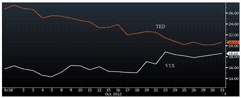 10月,与我们上月预测相符,由于QE3落地之后到年末之前相对确定,欧债危机的影响突出起来。但由于欧洲央行的OMT承诺“不战而屈人之兵”,短时间内压低了外围国家的收益率,当然也使得西班牙等不急于求援,市场一时找不到焦点,少了方向。在这种情况下,经济基本面吸引了更多的目光。美国大选前的数据超乎预期但恐难持续,欧元区的经济数据则继续疲弱,因此QE3后高涨的风险偏好显著回落,代表避险需求的VIX指数上升至18.6;代表流动性的TED指标则继续回落,显示主要央行继续宽松货币带来的流动性上升。在流动性上升而风险偏好下降的复杂形势下,各类资产走势盘整且零乱。