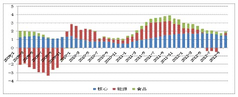 日本通缩形势尤其严峻。最新数据显示,日本连续第四个月通缩,9月同比为-0.3%。去除生鲜食品之后,同比为-0.1%,连续第5个月处于负值区间。观察各分项数据,食品、住房、家具、服饰、医疗、文娱以及其他类商品的价格都在不断下跌,仅水电燃气、交通通讯和教育价格还在上升。如果去除食品、能源等波动较大项目的影响,9月核心CPI同比为-0.6%,比上月-0.5%的态势还有所深化。2009年1月以来,日本核心商品的价格就一直处于下降状态。今年上半年本有改善的迹象,但5、6月份的数据显示这一过程中断。日本央行本次经济展望中也大幅调降了2012年通胀预期,从0.2%下调为-0.1%;工业原材料价格指数更从-0.2%下调到-1.1%的水平。
