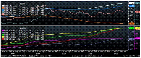 其中白线为欧元区整体失业率,黄线为西班牙失业率,红线为希腊失业率,绿线为葡萄牙失业率