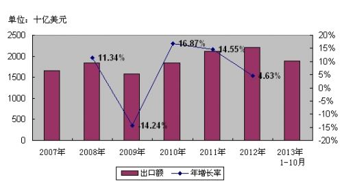 2007-2013年美国出口额及年增长率 资料来源:美国商务部