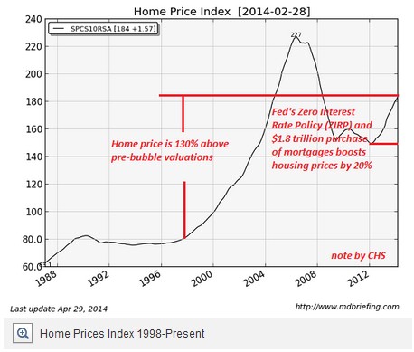 下图显示,当前的房价较泡沫前的水平高出130%,美联储的零利率政策和1.8万亿美元抵押贷款证券购买计划刺激房价提升了20个百分点。