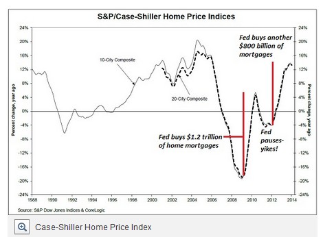这便是所谓的收益递减:美联储使出了浑身解数来支持房市,但房价在这种背景下仅微弱增长了20%。