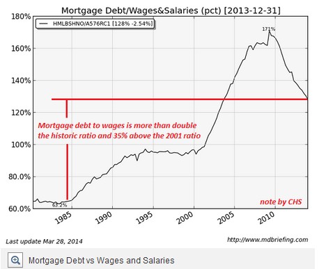 与此同时,抵押贷款受到薪资收入影响,抵押负债与工资/薪金之比仍比历史低位高出近一倍。债务/工资比率在互联网股市泡沫盛行的那几年攀高,因财富的日益增加鼓励人们相信债务水平的上升将会被收入和股市财富的增长所抵消。
