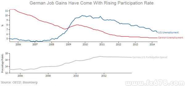 随后再来看到失业率问题。在失业率层面上,德国的表现远超美国。自从2009年至今,德国一直保持了相对较低的失业率,而美国尽管失业率也在走低,但是和德国相比显然还是“高高在上”。