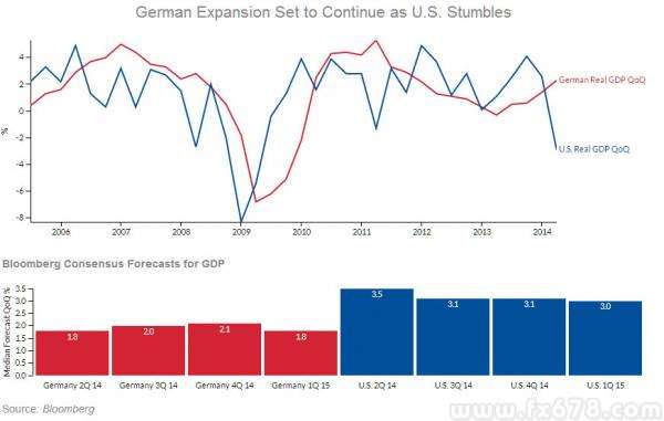 首先来看GDP数据,进入2014年之后美国的表现一落千丈,而德国自2013年之后就稳步攀升。从两者最近期的表现来看,显然德国更强一些。