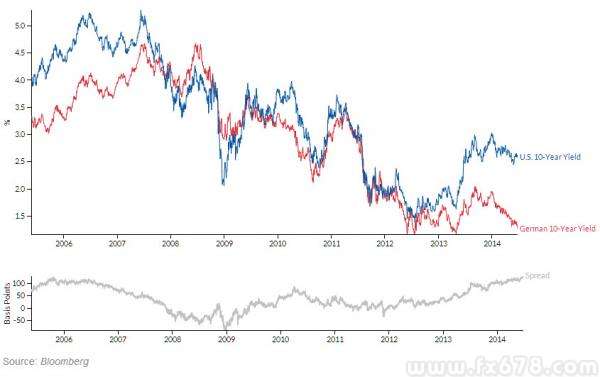 最后观察的是债券成本。10年期美债的收益率目前远远高于德债,欧元区和美国的货币政策取向导致两者差异化。在这个层面上,德国依然占据优势。