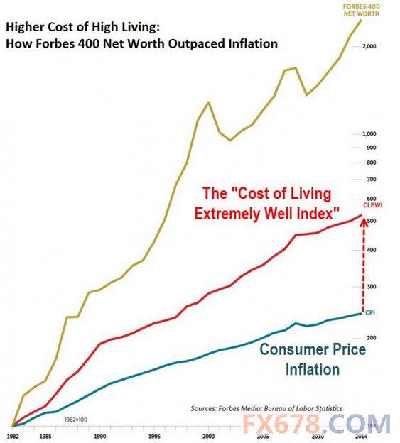 据福布斯发布的奢侈生活价格指数(Cost of Living Extremely Well Index,简称CLEWI)显示,自1982年以来,1%富裕人群的商品物价指数是全国平均通胀的两倍,该指数30年内通胀增长了400%(500减去100后除以100 =4=400%)。
