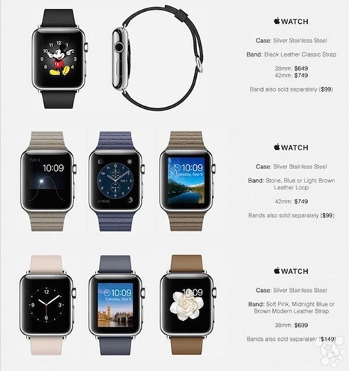 Apple Watch版(标配版),使用多款外壳,多款表带,尺寸只有两种38mm与42mm的Apple Watch价格也不同,标配版的表带可单独购买,售价有三种:49美元(306人民币),99美元(619人民币)和149美元(932人民币)的不同材质表带价格。