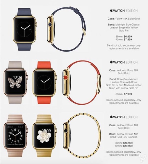 2月28日消息,据传Apple Watch的部分版本和表带搭配价格曝光,图片具体来源不详,通过曝光的图片与官方网对比发现标价上还有些问题,重点是官方已删掉了里面部分款表带,而这曝光售价的标价里居然还有。目前官方信息显示多款表带可供选择:三款皮制表带,一款链式表带,一款米兰尼斯表带,及一款高性能fluoroelastomer表带系列。根据曝光的价格,在国内价格请自行添加17%,这么看来K金版来看价格还算厚道,与传统瑞士表相比也就差个机芯的价格。