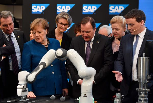 德国总理默克尔(左二)在汉诺威工业博览会上观看一只机械臂如何工作(法新社)