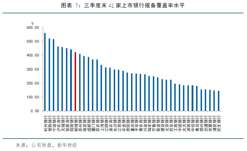 报告期内,邮储银行通过持续加强资产质量管控,高效开展清收处置,资产质量保持稳定的同时,推动风险抵补能力继续提升。三季度末,邮储银行拨备覆盖率422.70%,较上年末上升14.64个百分点。邮储银行风险抵补水平,在六大行中居于首位,在41家上市银行中居于第8位。
