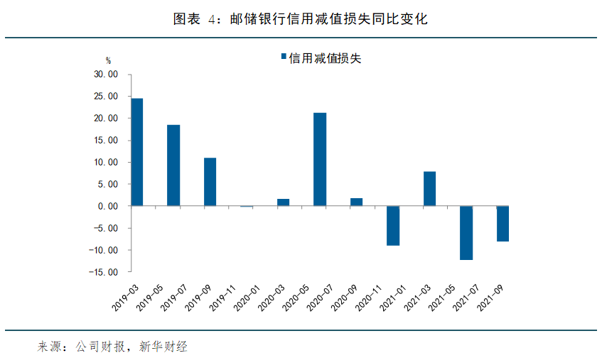 成本方面,前三季度,邮储银行营业支出1660.54亿元,同比增加4.17%。其中,业务及管理费1268.25亿元,同比增加97.47亿元,增长8.33%,成本收入比53.21%,同比下降0.93个百分点,成本管控效率进一步提升。此外,信用减值损失372.67亿元,同比减少32.98亿元,下降8.13%,主要是该行信贷资产质量保持稳定,不良贷款率稳中有降,客户贷款减值损失较去年同期下降。信用减值损失下降意味着拨备计提减轻,有利于反哺利润增长。