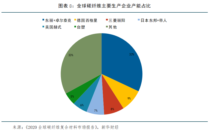 全球碳纤维特别是高性能碳纤维由日本、欧美企业所垄断。目前,全球前五大企业为日本东丽(美国卓尔泰克被东丽收购)、德国西格里、日本三菱丽阳、日本东邦、美国赫氏,2020年合计市占率62%。日本是全球最主要的碳纤维生产国,世界碳纤维技术主要掌握在日本公司手中,其生产的碳纤维无论质量还是数量上均处于世界领先地位,日本东丽更是世界上高性能碳纤维研究与生产领域的“领头羊”。东丽与卓尔泰克合并后,总产能在位列第一,约5.37万吨。西格丽集团和三菱丽阳分别位列第二和第三,产能分别为1.48万吨和1.41万吨。