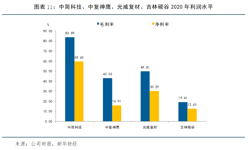 国内产能居前的中复神鹰、吉林碳谷、光威复材等都有应用于航空航天领域的高性能碳纤维产品,而专注于高性能碳纤维产品的国内代表企业为中简科技。其通过多年技术积累,突破了高于T700级碳纤维的工程产业化技术,打破了国外对航空航天领域高端碳纤维的封锁。中简科技规模化生产的产品和主要收入来源为ZT7系列。由于专注于高端产品,中简科技碳纤维产品附加值及利润水平处在领先地位。