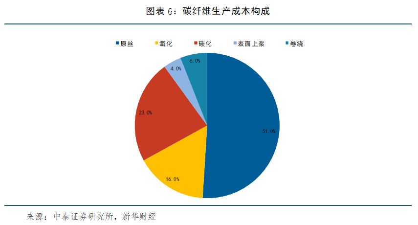 碳纤维原丝制备是碳纤维产业链的核心环节,碳纤维原丝的质量和成本很大程度上决定了碳纤维的质量和生产成本。碳纤维原丝制备占碳纤维生产成本的一半以上,其性价比与供应稳定性是碳纤维产业链的重要影响因素,直接影响着碳纤维的应用领域的广度。对于碳纤维原丝,经过长期技术研发与工程化实践,国际上形成了湿法纺丝和干喷湿法纺丝两种原丝制备工艺。相较湿法纺丝,干喷湿法纺丝可以进行高倍的喷丝头拉伸,纺丝速度是湿法的 3-4 倍,明显提升了生产效率同时降低了生产成本。不过由于干喷湿纺工艺技术难度大,目前世界上仅少量企业掌握该生产技术并形成成熟的碳纤维产品。