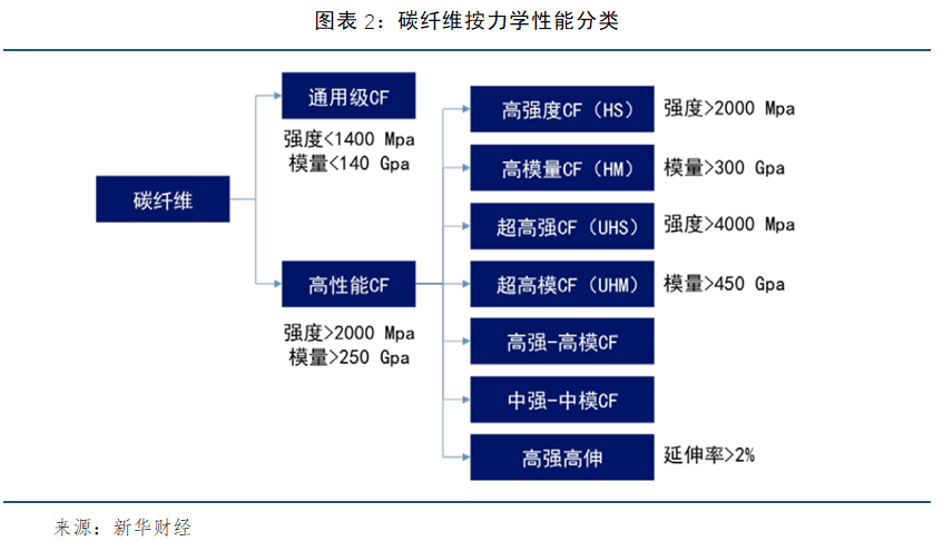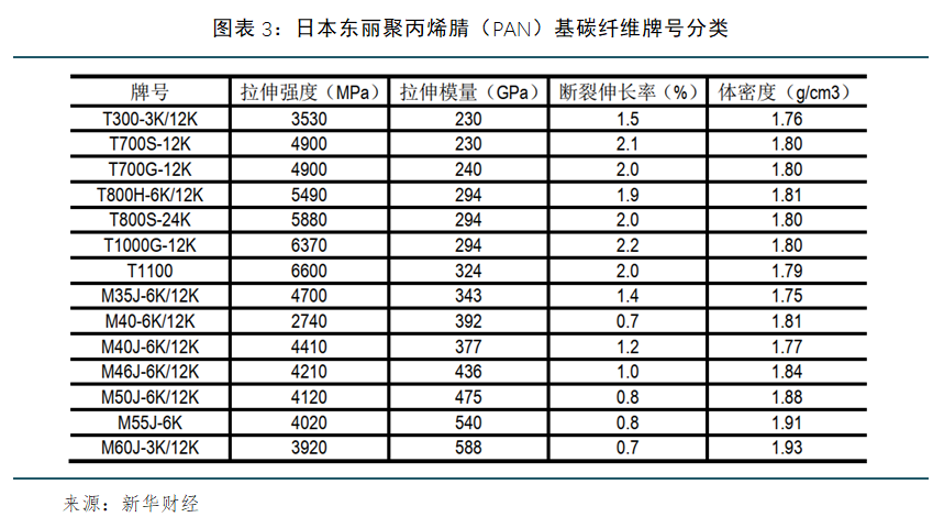 碳纤维可以按照原丝类型、形态、力学性能等不同维度进行分类。按照原丝种类,由聚丙烯腈(PAN)原丝生产出的聚丙烯腈(PAN)基碳纤维占据主流地位,产量占碳纤维总量的 90%以上。碳纤维按力学性能分为通用型和高性能型。通用型碳纤维强度为1000MPa、模量为 100GPa 左右。高性能型碳纤维又分为高强型(强度 2000MPa、模量 250GPa) 和高模型(模量 300GPa 以上)。强度大于 4000MPa 的又称为超高强型;模量大于 450GPa 的称为超高模型。在实际使用中,龙头企业日本东丽的产品编号通常被作为行业标准,如日本东丽的碳纤维产品编号有T300、T800、M30等多种,其中T表示强度,M表示模量。强度上,T后缀的数字越大代表产品的强度越大;模量上,M后缀的数字越大代表产品的模量越大。