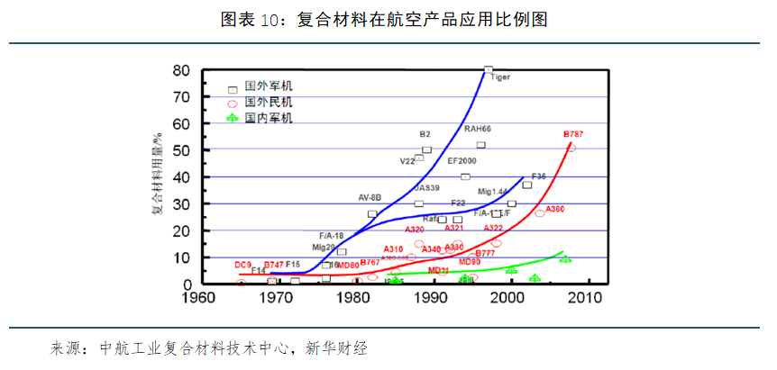 在航空领域,碳纤维复合材料自20世纪70年代以来首次被应用在飞机上的一些二级结构,如整流罩、控制仪表盘和机舱门等。近三十年来,随着高性能碳纤维和预浸料-热压罐整体成型工艺的成熟,碳纤维复合材料的使用逐步进入到机翼、机身等受力大、尺寸大的主承力结构中。近年来,碳纤维复合材料在军用飞机上的用量逐年增加。由于碳纤维复合材料具有低密度、高比强度、高比模量、可设计性强等优点,在飞机上采用碳纤维复合材料可以大幅度减轻机体结构质量、改善气动弹性,提高飞机的综合性能,大批量飞机零部件相继采用碳纤维复合材料,并且采用复合材料的面积、部位和重量也日趋增加。