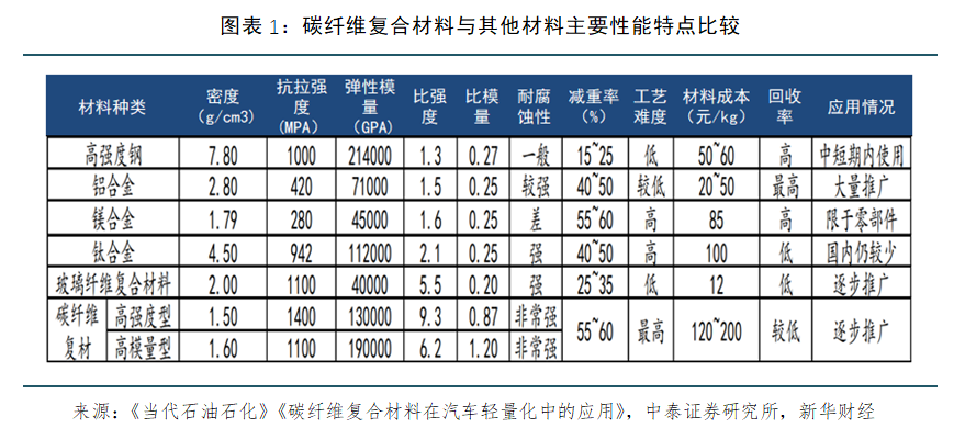 碳纤维(Carbon Fiber,简称 CF)是由有机纤维(粘胶基、沥青基、聚丙烯腈基纤维等)在1000℃的高温环境下裂解碳化形成的含碳量高于90%的无机纤维,不仅具有碳材料的固有本征特性,又兼备纺织纤维的柔软可加工性。作为一种国家亟需、应用前景广阔的战略性新材料,碳纤维具有目前其他材料无可比拟的高比强度(强度比密度)及高比刚度(模量比密度)性能,还具有耐腐蚀、耐疲劳等特性。相较其他材料,碳纤维复合材料密度最低,因此在轻量化、高强、高模等应用领域,碳纤维复合材料的性能优势明显。